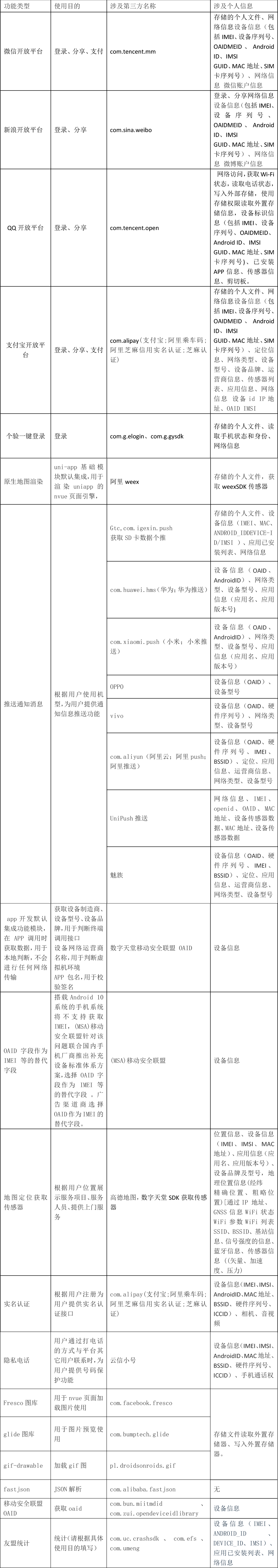 我们使用的第三方软件工具开发包(SDK)信息如下: